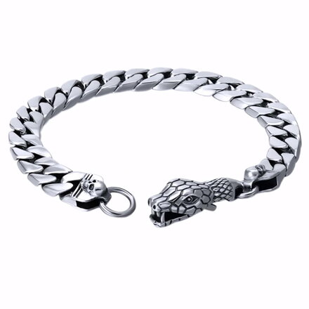 Náramok v tvare hada z leštenej nerezovej ocele. Náramok sa zapína otvorením papule hada a zahryznutím do krúžku na konci náramku.